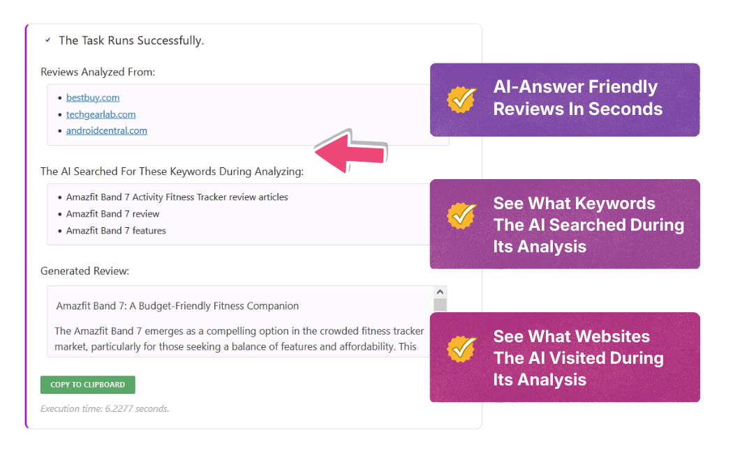 - It generates fresh, AI-answer optimized review content based on those top-ranked articles