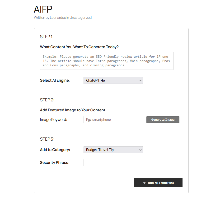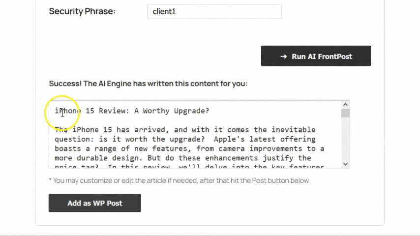 This security phrase will be asked every time you use AI FrontPost content generator on the front end. It must be setup so nobody can post anything to your website using AI FrontPost if they don't know the security phrase.