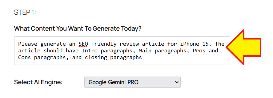 3. On the textarea field, you can enter a prompt for the AI engine to create your content: